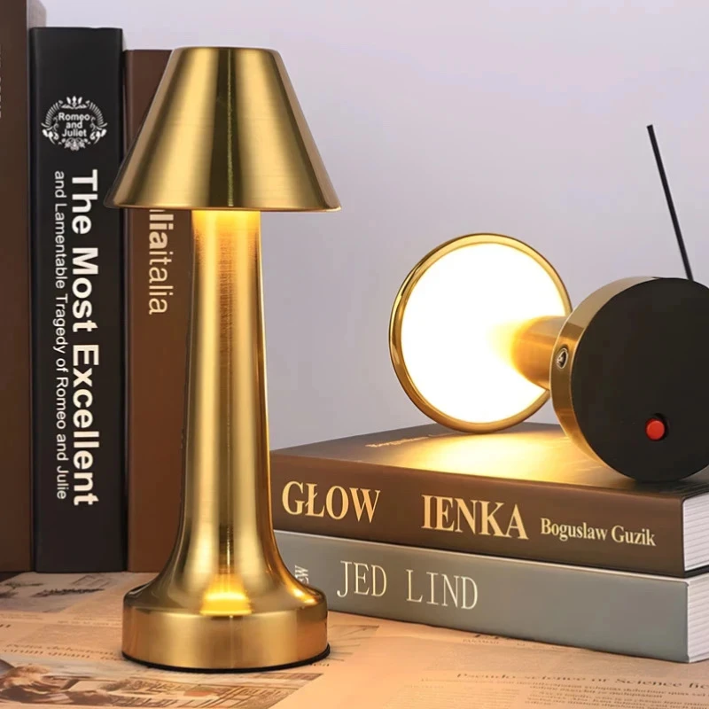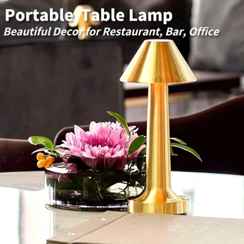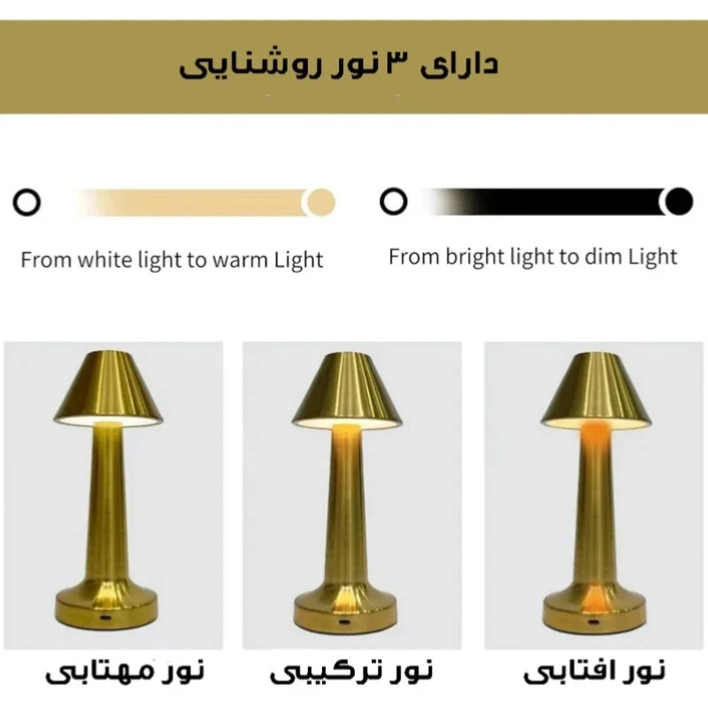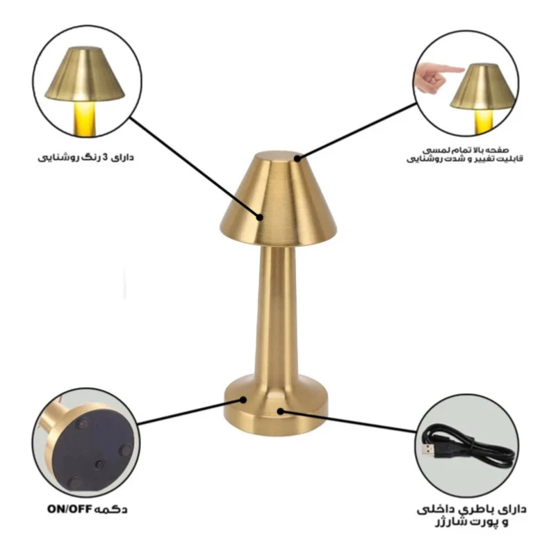 آباژور رومیزی فلزی با روکش طلایی و سه نور قابل تنظیم، یک گزینه شیک، قابل حمل و بسیار کاربردی برای خانه، کافه، میز مطالعه و… است که با صفحه لمسی و باتری داخلی، تجربه استفاده راحت و مدرنی ارائه میدهد.