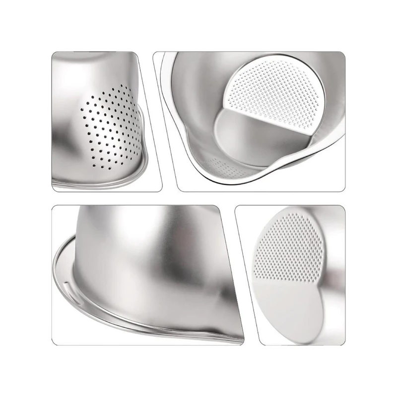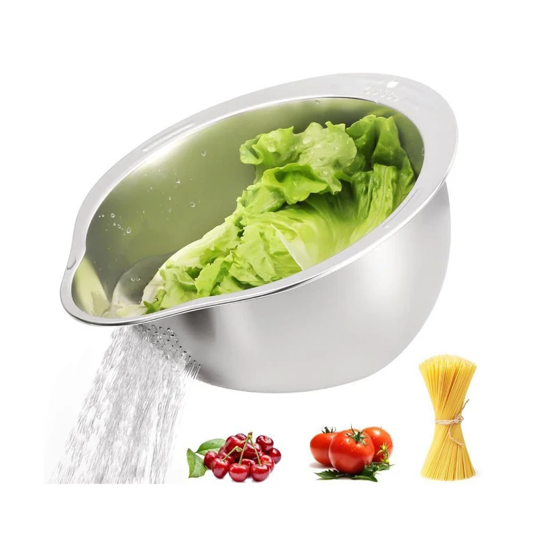 این ست حرفهای با ابعاد ۲۸×۲۵ سانتیمتر (قطر دهانه) و ارتفاع ۱۴ سانتیمتر، گزینهای کاربردی برای هر آشپزخانه محسوب میشود و نیاز به سبد و لگن جداگانه را از بین میبرد.