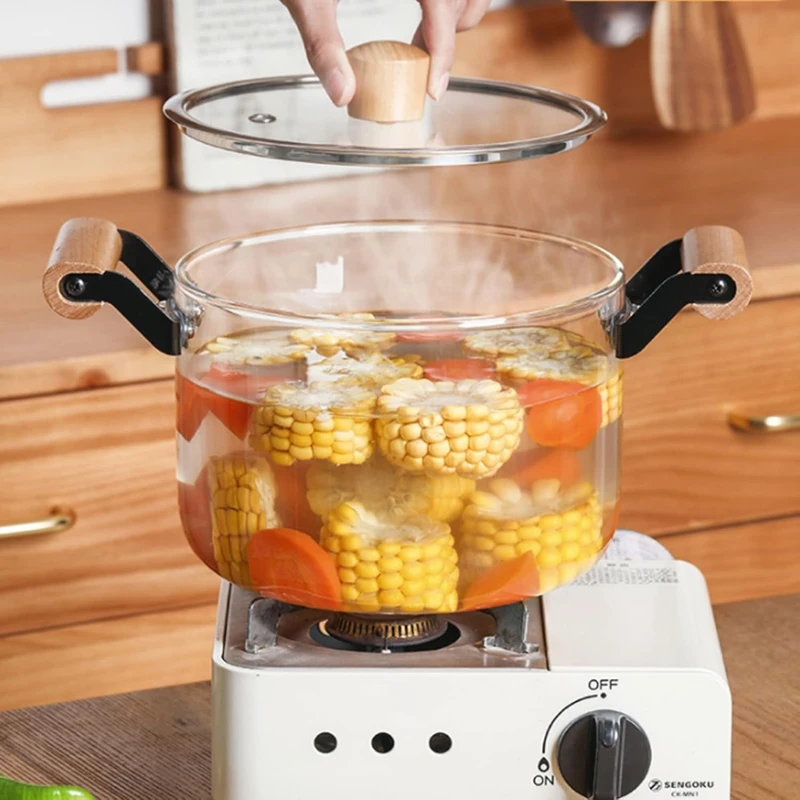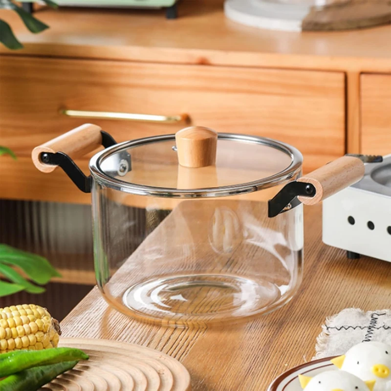 این قابلمه شیشهای جذاب از شیشه بوروسیلیکات باکیفیت و بدون سرب ساخته شده و گزینهای بسیار سالمتر نسبت به ظروف پلاستیکی یا استیل معمولی برای پختوپز به شمار میرود. یکی از ویژگیهای جذاب آن، دستههای چوبی عایق حرارت است که هنگام قرار گرفتن روی حرارت بالا داغ نمیشوند و امکان استفادهای ایمن و راحت را فراهم میکنند.