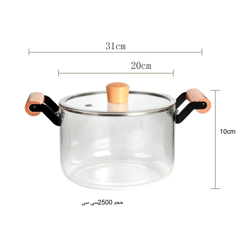 قابلمه شیشهای یک انتخاب سالم، مقاوم و شفاف برای پختوپز روزانه است که با دستههای چوبی عایق حرارت، تمیز شدن آسان و امکان استفاده روی اجاق، فر و مایکروویو، تجربه آشپزی را راحتتر میکند. سایز این محصول ۲۰ و حجم آن ۲۵۰۰cc است.